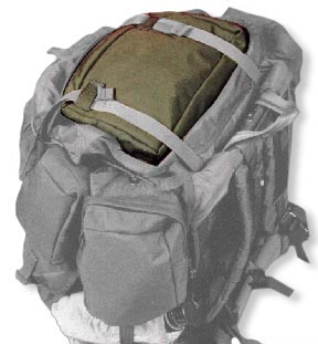 This is a zippered pocket 12"x8"x4" sewn onto the top of the rucksack. The pocket has dual zipper pulls so a claymore can be daisy chained and the det-cord can be run to other rucks. Can also be used for other non-destructive storage.