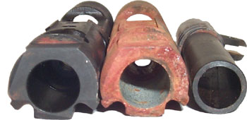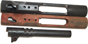 Blak-Tac will be used by Olympic as a complete replacement for hard chrome finish. Notice the bore of the bolt carrier to the left. After 7 days in a 30% salt solution, the center bolt carrier (a new parkerized carrier with a chrome bore) is rusted inside and out! The bolt carrier to the left, and SS 1911 barrel to the right (both treated to the Blak-Tac process) are rust free. |