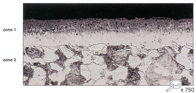 Shown at a magi fa cation level of 750X, the photo above reveals the results of Blak-Tac metal treatment to steel bar stock. Creating 2 zones in the metal, the surface becomes more dense, harder, smoother, and much less likely to chip, crack, or break. Being smoother the likelihood of galling is practically eliminated, and friction is reduced dramatically.