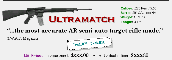 This is a small sampling of what Olympic Arms has to offer for Law Enforcement. We have a Test and Evaluation (T&E) arrangement available for certain firearms and a discount program for quantity purchases. Also, most of our firearms can be customized for specific purposes - call for details. If you have any other questions, or would like a catalog, please feel free to contact Corey Sattler at his e-mail address, or see our PostOffice for other methods of communications.