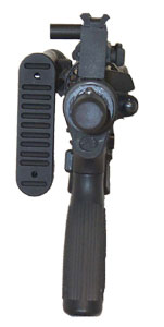 From the back, the OA-93PT looks like this with the stock fully detached, and in its stow-away position, locked onto the FIRSH rail handguard of the carbine.