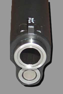 Also seen in this shot, is the end cap of the full length recoil spring guide and the recessed target crown on the barrel. As you can see, the barrel has traditional lands & grooves type rifling. This is not however your standard pistol barrel. |