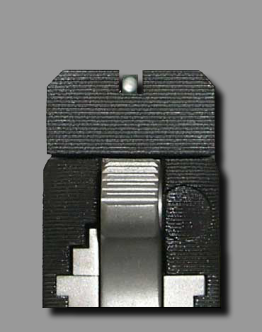 Exceptional fit of the beavertail, mainspring housing, as well as the slide to frame match is glaring. It is also easy to see some of the "melted" look of the handgun when looking at the commander hammer and thumb safety. The checkering of the (in this case) arched mainspring housing is show as well, as is the relief of the memory groove in the beavertail. Perhaps the most obvious (as it should be) feature is the large, serrated, fully adjustable rear sight. These serrations are continued and matched with the rear of the slide itself to help in the reduction of glare. |